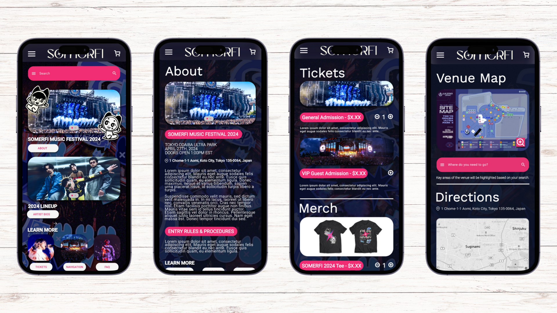 I designed a poster for a fictional J-Pop music festival, Somerfi, emphasizing vibrant visuals, interactive experiences, and cultural immersion. Central to the brand were two animal mascots I created, embodying the festival's playful and dynamic spirit. Sticker-bombing served as the core motif for its visual identity, adding layers of fun and energy. Promotional website wireframes were also created for this project using Figma.